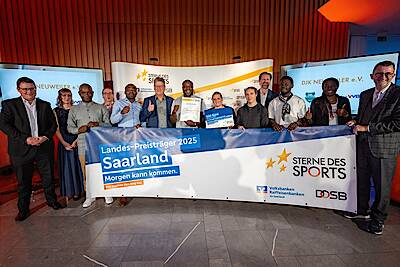 Die DJK Neuweiler wurde am Donnerstag, den 09.10.25, in der Staatskanzlei in Saarbrücken im Rahmen der diesjährigen Aktion "Sterne des Sports" für die Durchführung des "1. Internationalen Sportfestes der Integration und Freundschaft" unter dem Motto "Es geht auch so!", welches am 19.04.25 stattgefunden hatte, mit einem Förderpreis geehrt. Der Ideengeber und Haupt-Organisator der damaligen Veranstaltung, Joel Tchuitcha Youmen, nahm stellvertretend aus den Händen von Sport- und Innenminister Reinhold Jost, des Vertreters der Volks- und Raiffeisenbanken Mang und Moderator Aaron Wollscheid den Preis entgegen und fand tolle und treffende Worte im Rahmen der Ehrung. Wir hatten es von 45 Bewerbungen saarländischer Vereine aus allen Sportarten, die unter dem Dach des LSVS angeboten werden, unter die letzten 6 Teilnehmer geschafft, dies erstmals in der Geschichte der DJK Neuweiler. Die drei ersten Plätze belegten wie erwartet und auch völlig verdient außerordentliche Vereinsprojekte aus ganz anderen Sportarten, wie z.B. ein Inklusionsprojekt für Cheerleader des Turnvereins Völklingen, welches nun das Saarland im Bundesentscheid in Berlin vertritt, oder z.B. die Neustrukturierung eines Turnvereins mit ganz neuartigen Angeboten des TV Illingen. Es war eine sehr gelungene Veranstaltung und wie Joel es sagte, wir werden "selbstverständlich ein 2. Internationales Sportfest der Integration und Freundschaft" erneut im nächsten Jahr ausrichten. Danke vom Verein an die beiden kamerunischen Organisationen, die dies alles auf die Beine gestellt haben und Dank an alle, die teilgenommen und mitgeholfen haben. Wir haben ein sehr schönes Banner von den Veranstaltern der Sterne des Sports erhalten, das wir im Bild gerade hochhalten, welches wir am Sportplatz aufhängen werden.